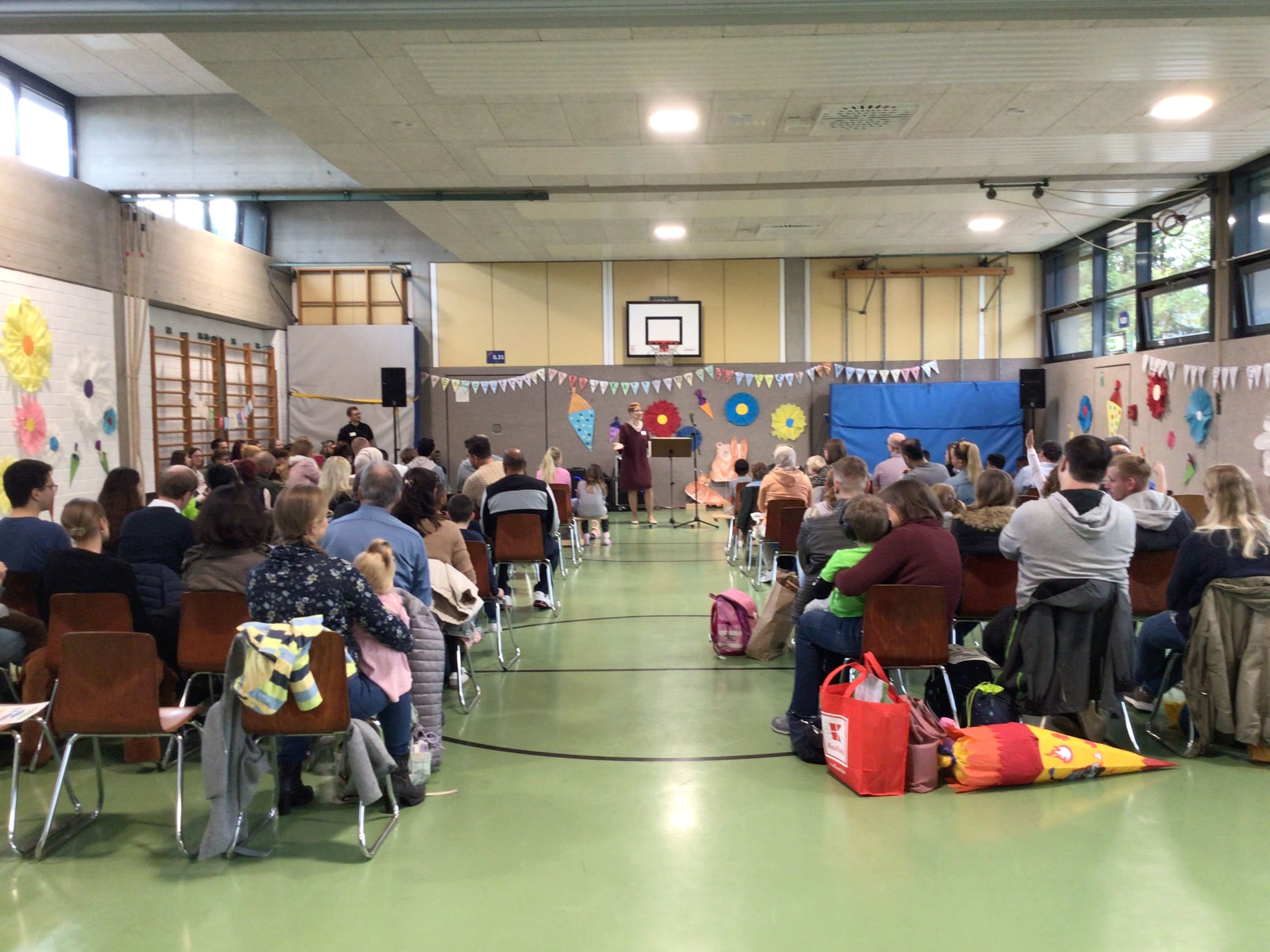 Heute durften 25 Erstklässler Einschulung feiern. Mit ihren neuen Schulranzen und den Schultüten verfolgten sie die Einschulungsfeier in unserer Turnhalle. Frau Lang begrüßte die Familien mit einer Geschichte über eine Schule der Tiere in der jeder in seinem Tempo lernen kann und nach seinen Talenten gefördert wird. Die 3. und 4. Klassen rundeten mit einem musikalischen Beitrag "ich bin anders als, du bist anders als" die Feier ab.