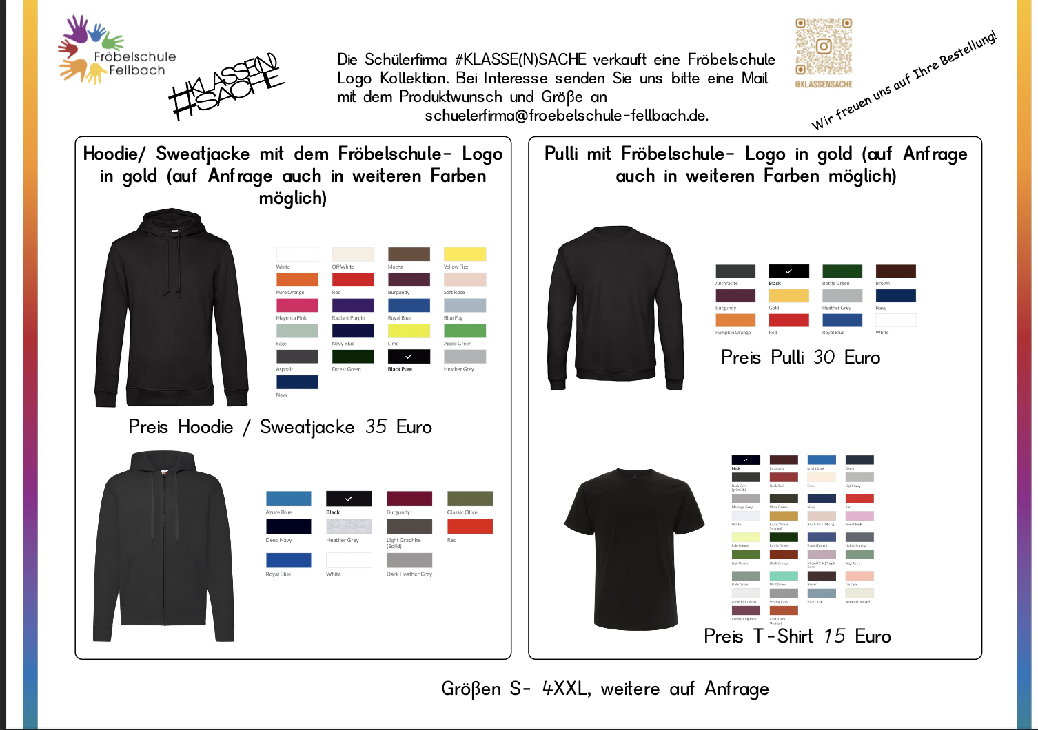 wir freuen uns, euch unsere brandneue Kollektion der Schülerfirma vorzustellen! Diese stylishen Hoodies, Shirts und Pullis tragen das Schullogo und sind perfekt für jeden Anlass – ob im Unterricht, beim Sport oder in der Freizeit.