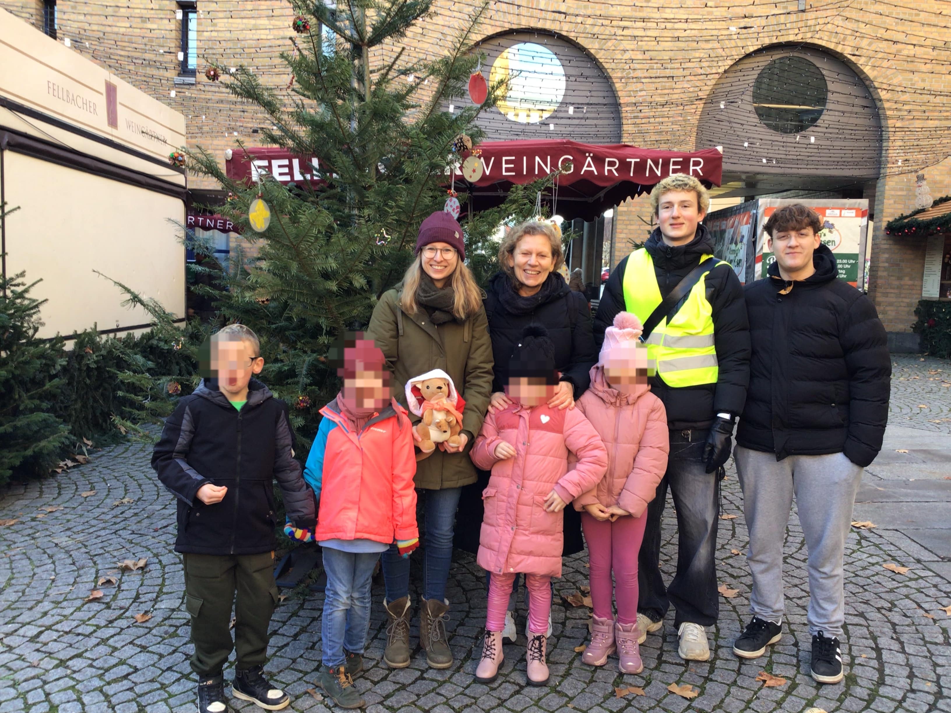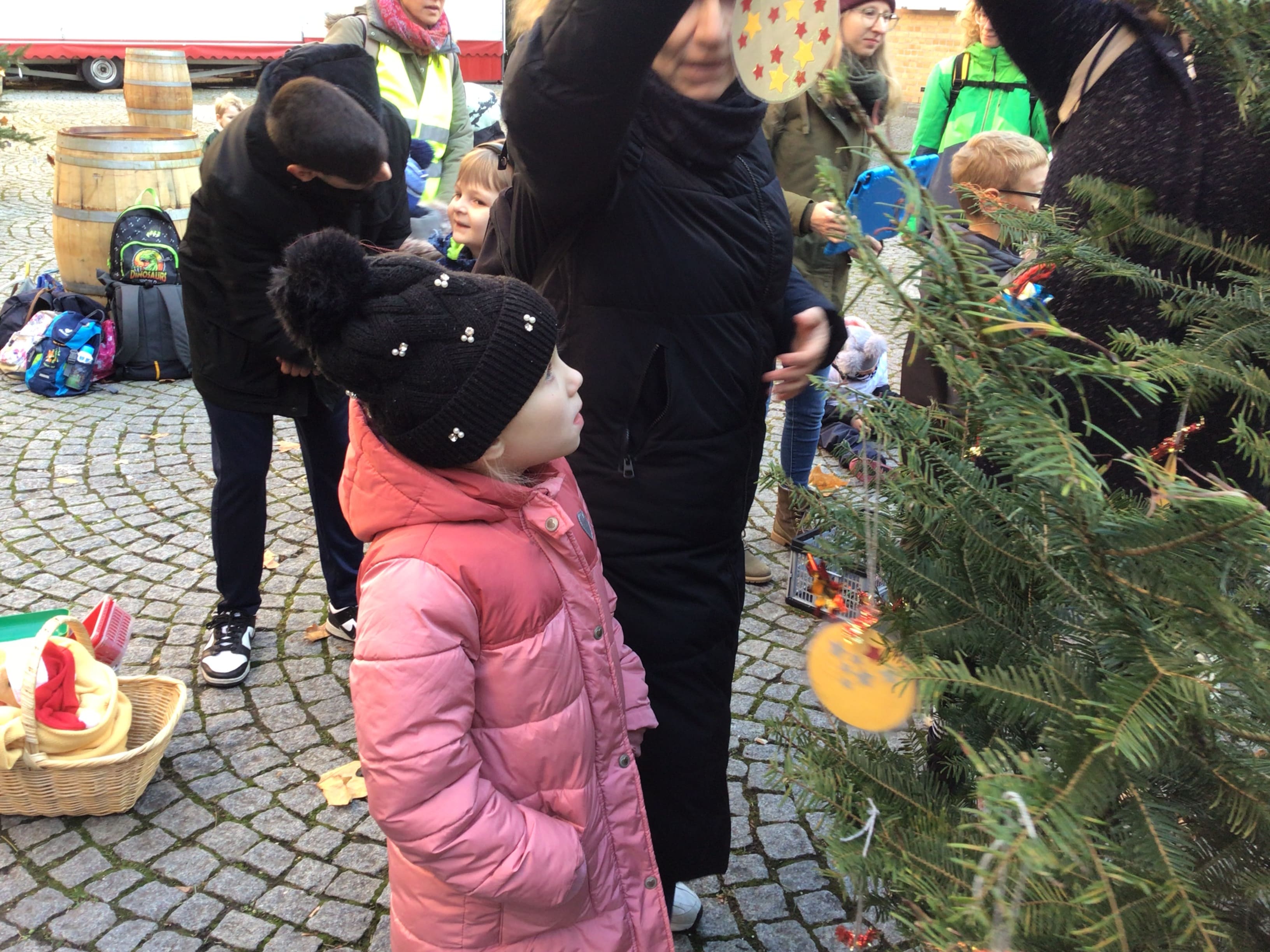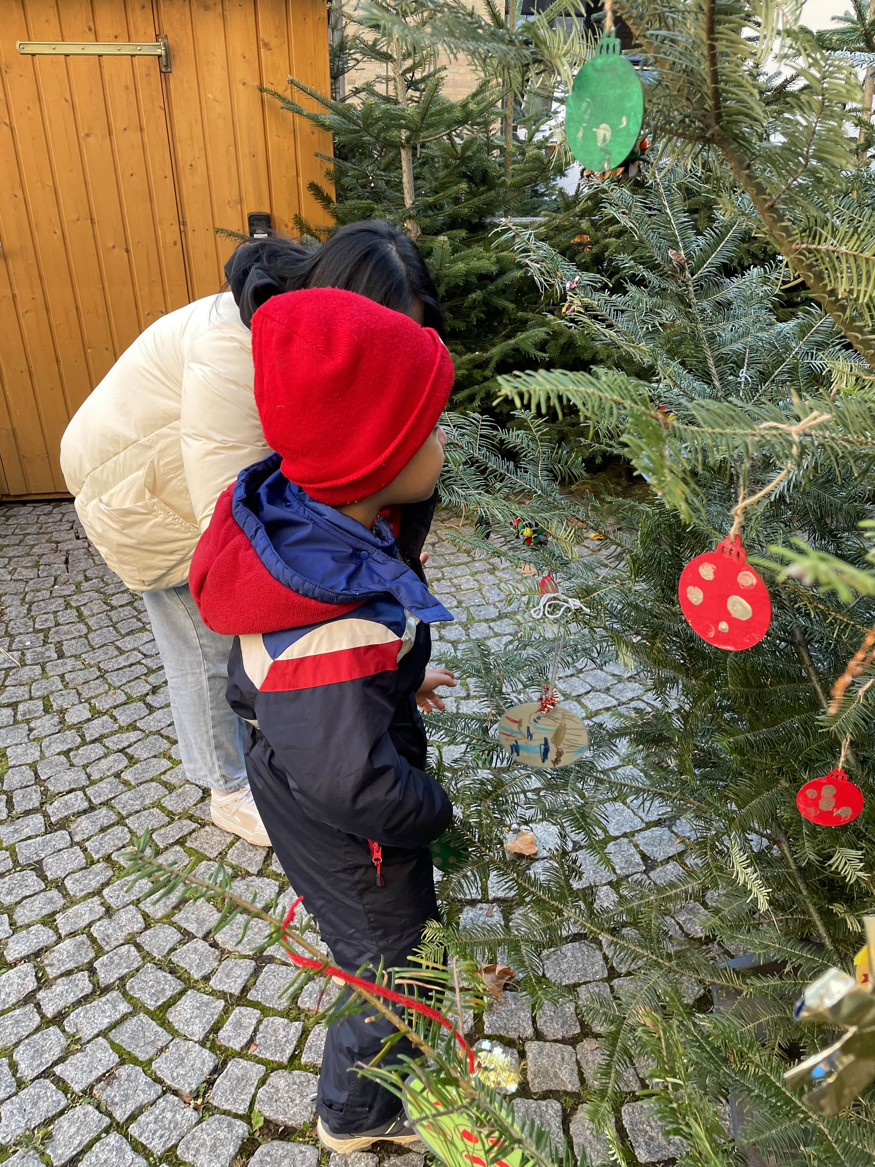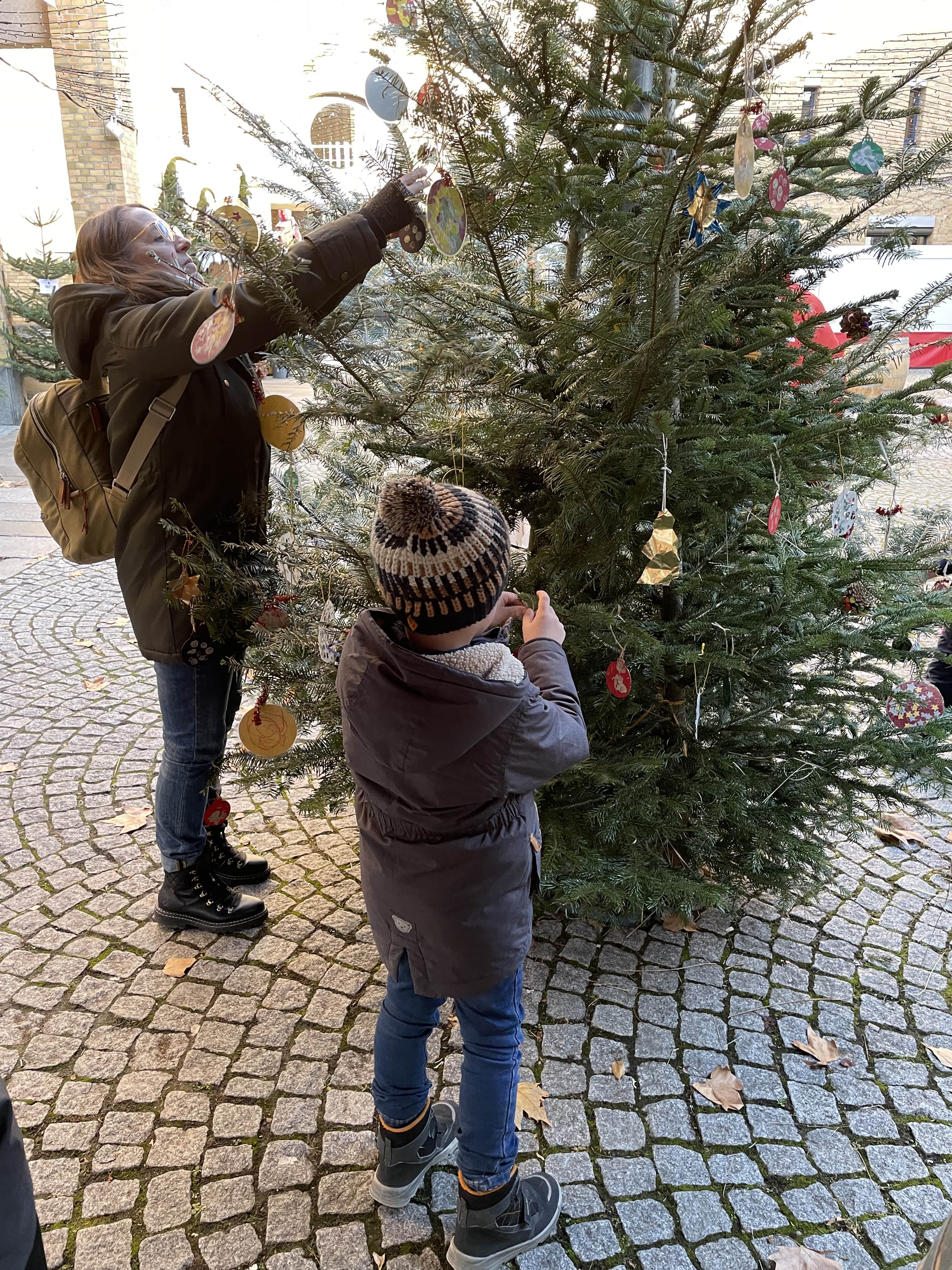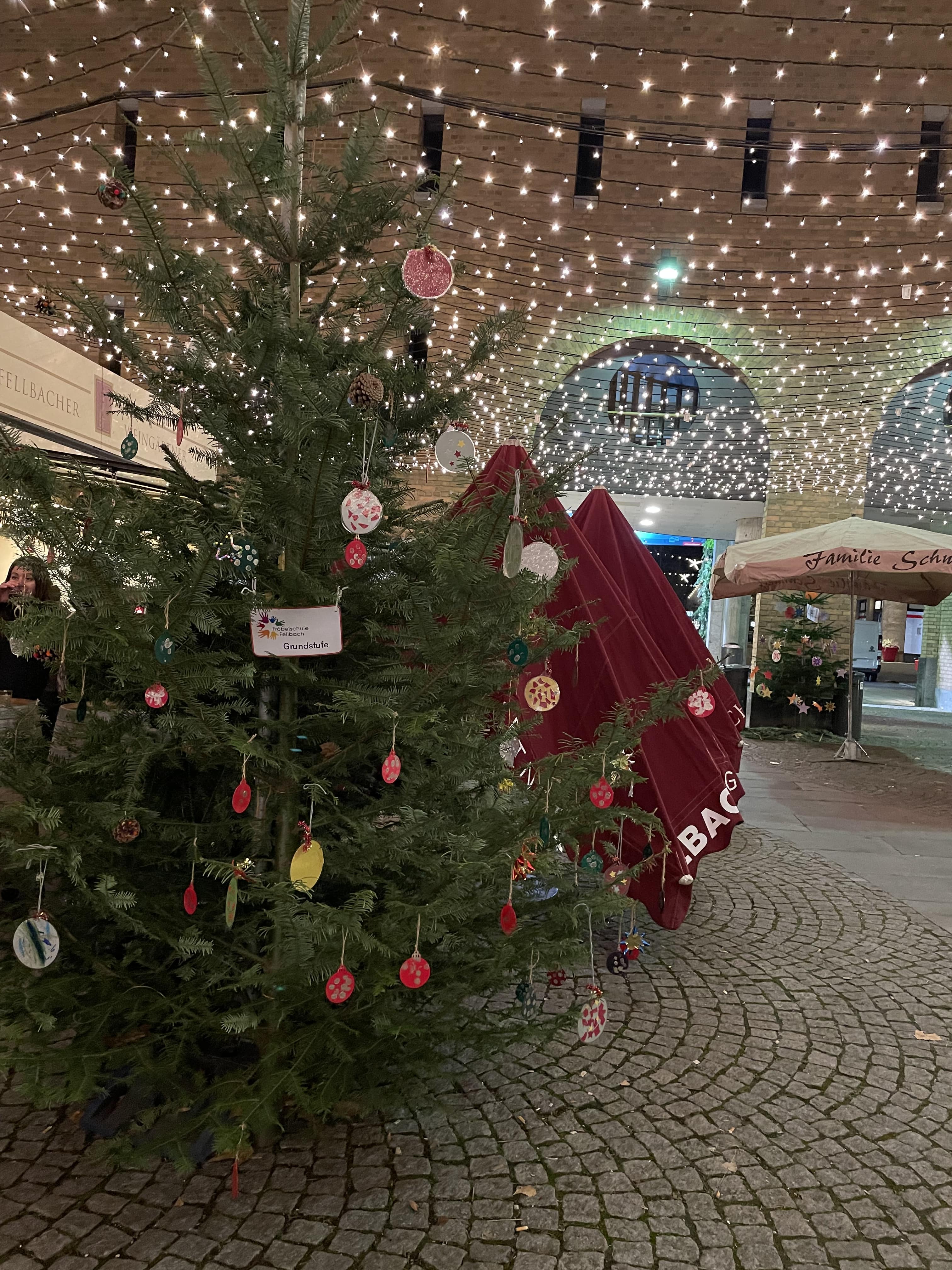Schüler*innen der Grundstufe schmückten mit gebasteltem Weihnachtsbaumschmuck die Tannenbäume rund um das Rathaus in Fellbach.